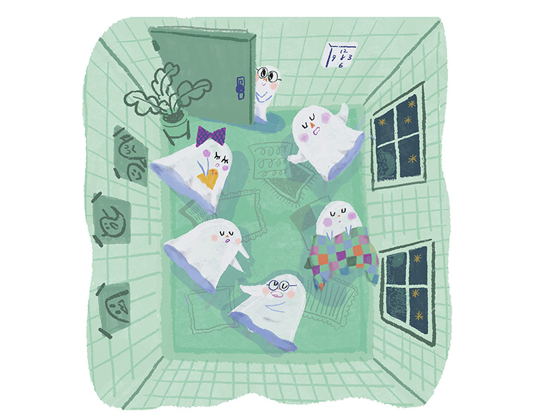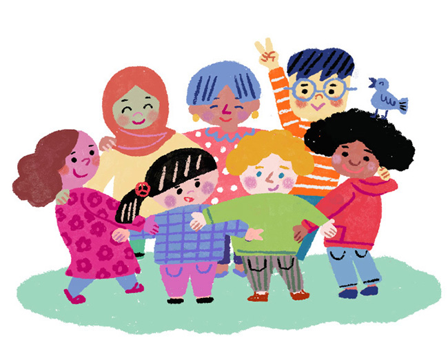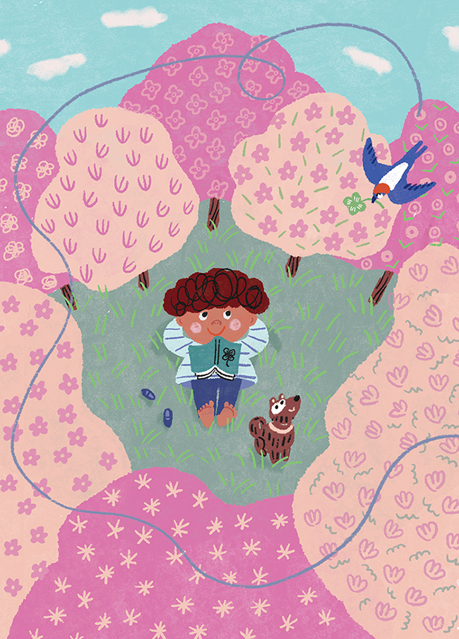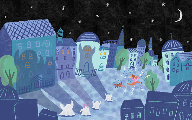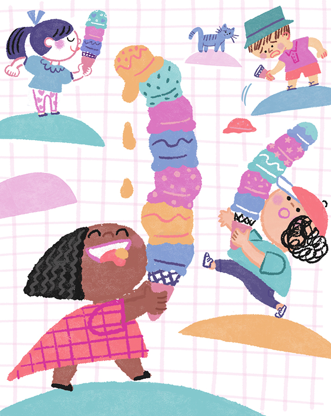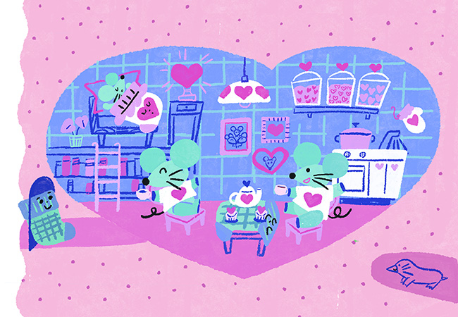 I create warm, playful worlds filled with charming, whimsical characters and a limited color palette.